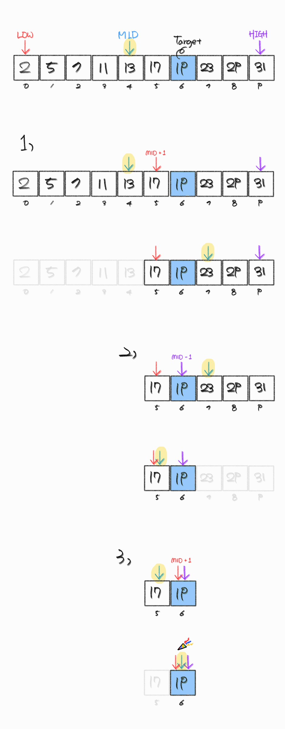 *MID : 중간 인덱스 (LOW + HIGH / 2)