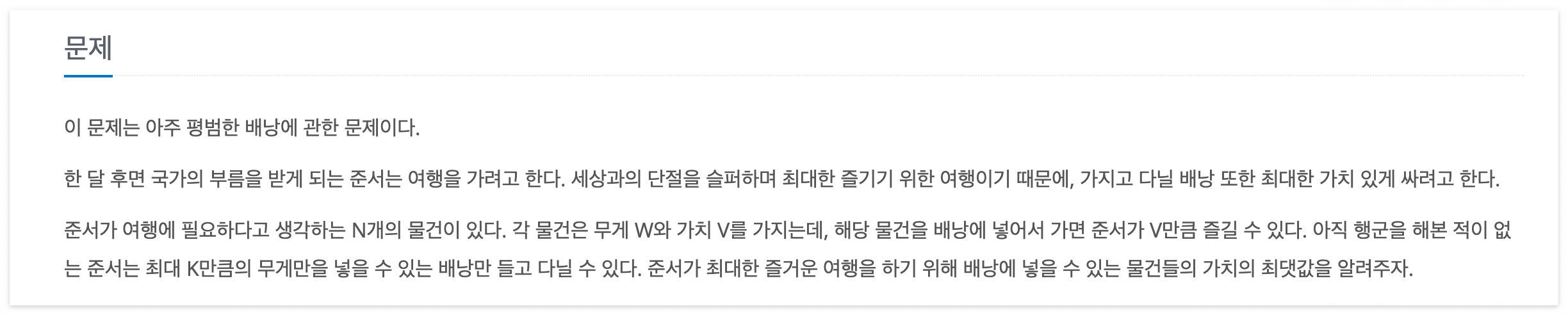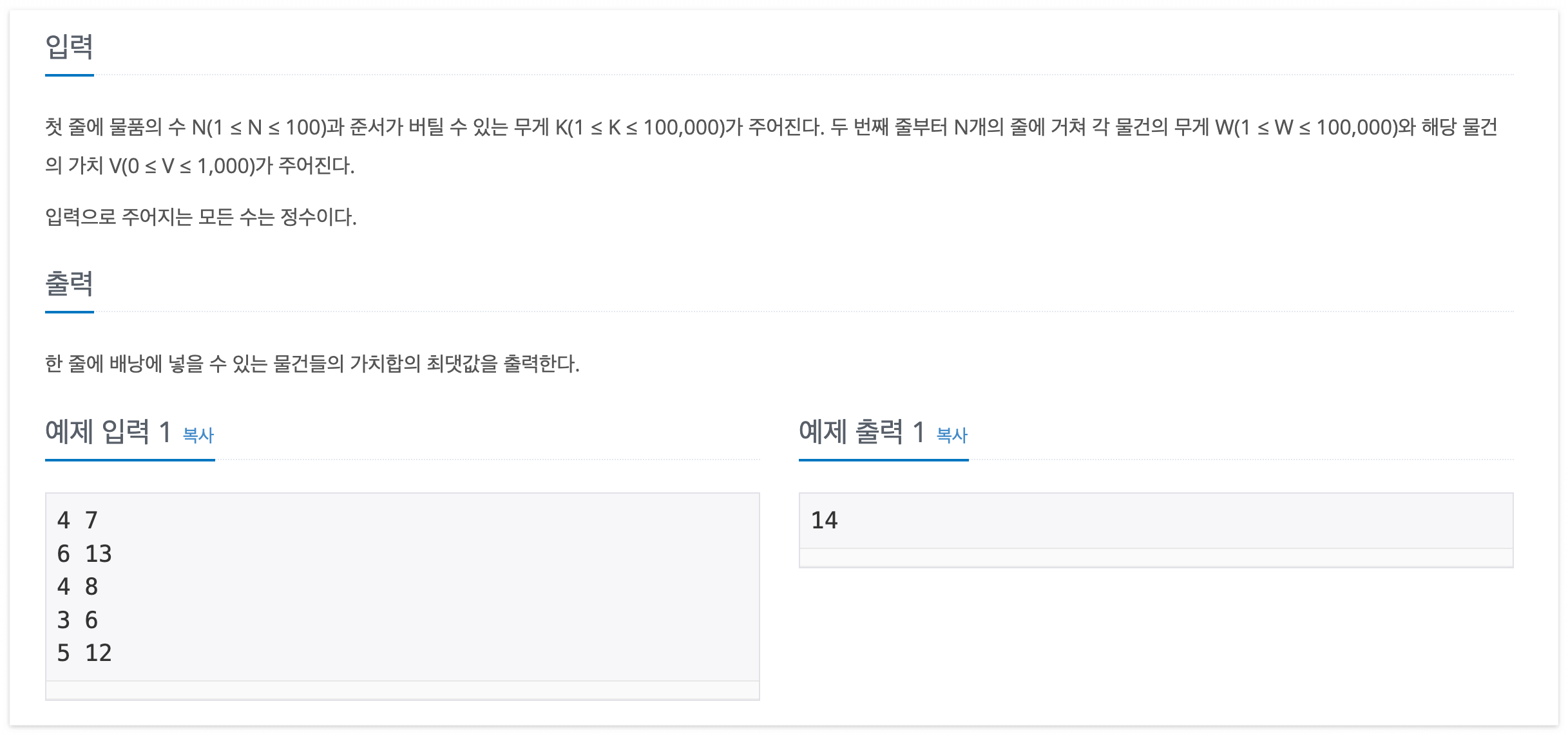 용량이 제한된 배낭에 넣을 수 있는 최대 가치를 구하는 유명한 문제인 Knapsack Problem 그 중에서 0/1 Knapsack Problem과 동일한 문제이다.