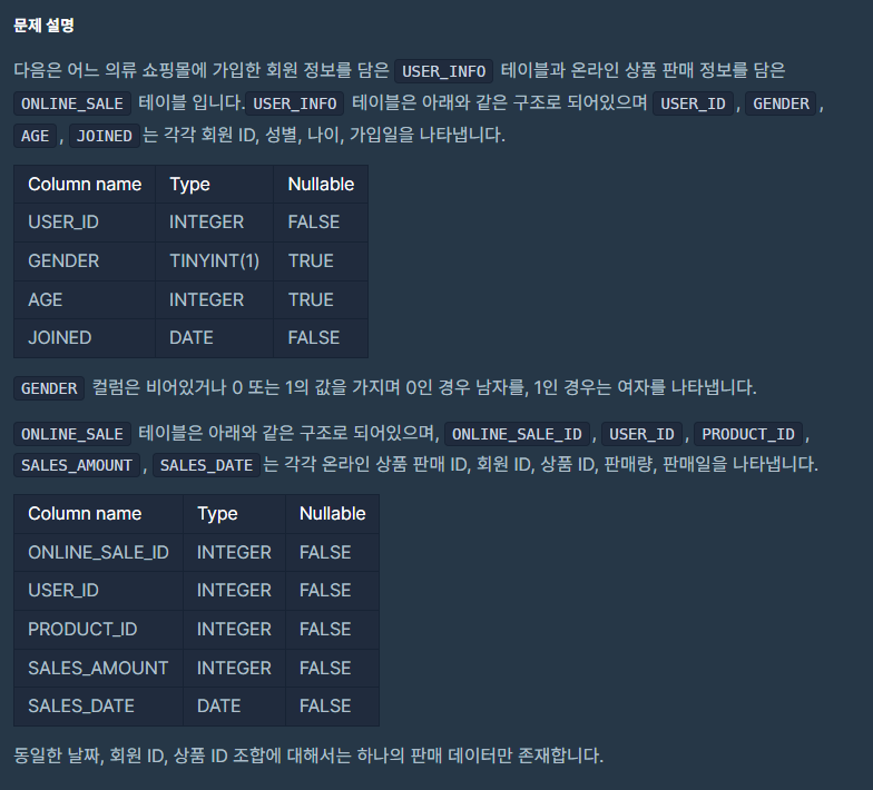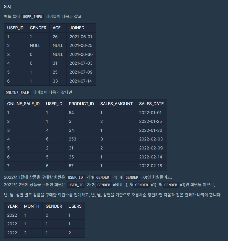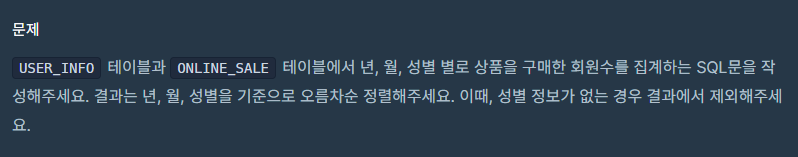 이 문제에서는 필요한 정보(년, 월 / 성별)가 두 테이블에 걸쳐 나누어져있습니다.